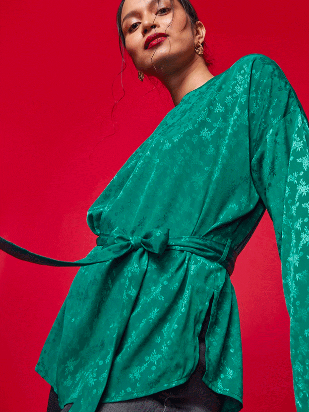 Lilac Front Tie Dress, Evergreen Jacquard Belted Top