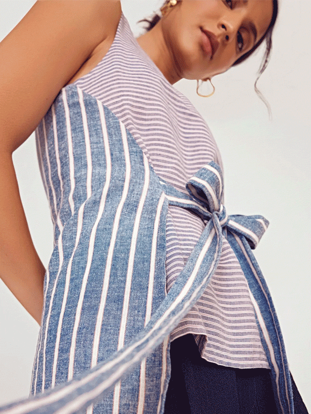 Floral Patchwork Shirt Dress, Blue Multistriped Tie-Up Top